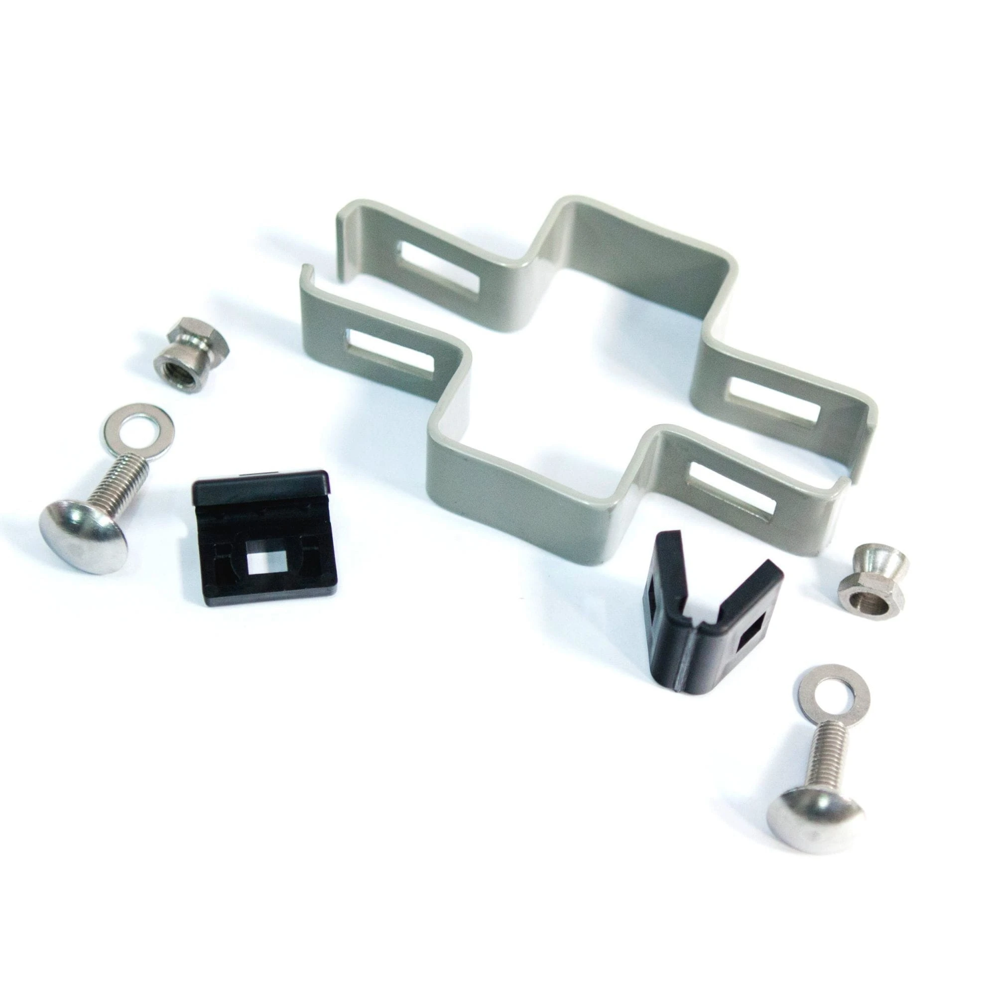 W skład zestawu wchodzą: obejma metalowa, uchwyty z tworzywa (tzw. książeczki) dedykowane panelom VEGA (o średnicy drutu do 6mm), podkładki nierdzewne, śruby nierdzewne M8x25mm, nakrętki samozrywalne nierdzewne M8.