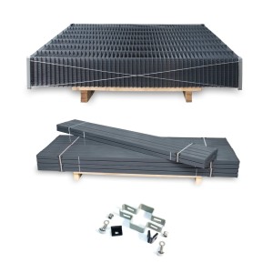 Zestaw zawiera: 25 szt. paneli, 25 szt. słupów Omega 60x40x1,5mm, 25 kompletów akcesoriów montażowych (obejmy) do zastosowania na słupie przelotowym (3 szt. na słup). Opcja: Ceowniki montażowe (komplet 49szt.) do zamontowania deski/podmurówki betonowej. Ceowniki stalowe, ocynkowane i powleczone poliestrowo.
