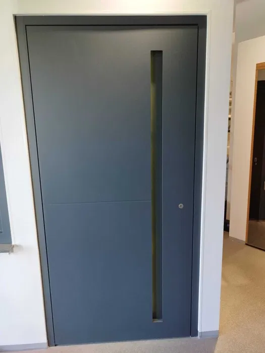 Drzwi od wewnątrz wykonane są z wysokiej jakości drewna w kolorze Rustical, natomiast z zewnątrz zabezpiecza je nakładka aluminiowa w kolorze RAL 7016, gwarantująca odporność na warunki atmosferyczne oraz trwałość przez wiele lat. Skrzydło o grubości 100 mm zapewnia doskonałą izolację termiczną i akustyczną, czyniąc drzwi energooszczędnym rozwiązaniem do nowoczesnych domów.