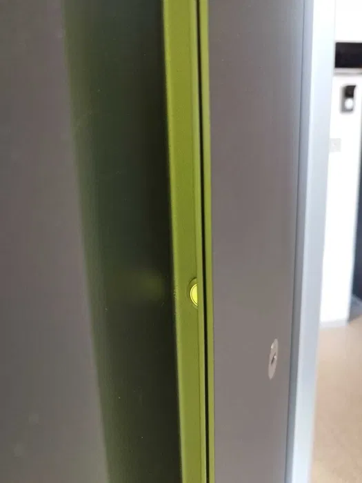 Wyjątkowy design drzwi podkreśla pochwyt kieszeniowy wpuszczany przez całą wysokość skrzydła, wyposażony w podświetlenie LED oraz przycisk zwalniający napięcie. Od wewnątrz skrzydło wyposażone jest w elegancką klamkę inox, a bezpieczeństwo użytkowania zwiększa automatyczny zamek.